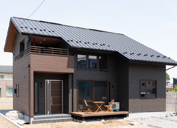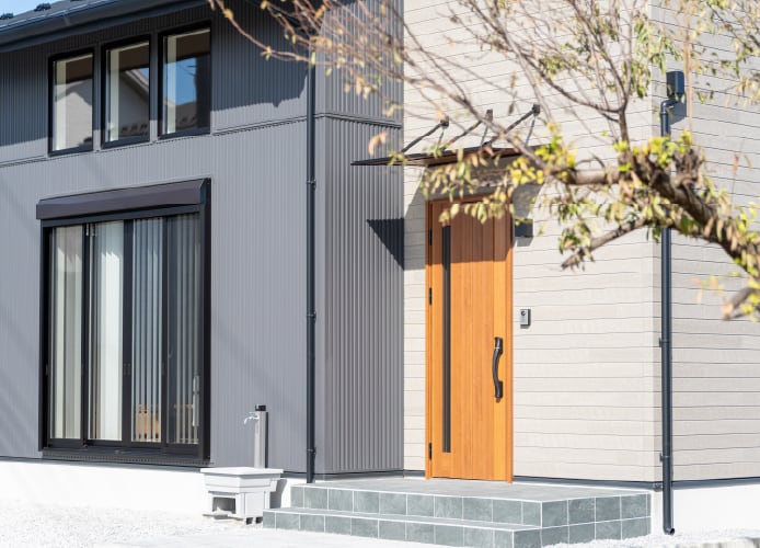 壁と屋根には、耐食・耐熱・耐久・耐震性に優れた「ガルバリウム鋼板」を。軒天には、デザイン性の高い「木目柄」を採用。