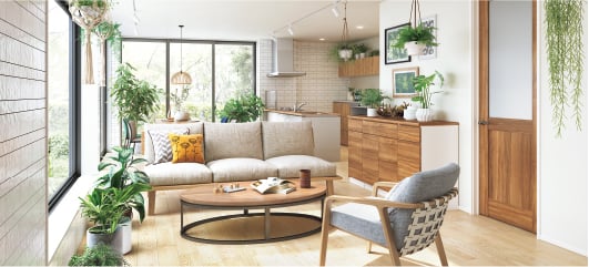 植物本来の魅力をインテリアに取り入れた、緑と明るい光に包まれた空間。