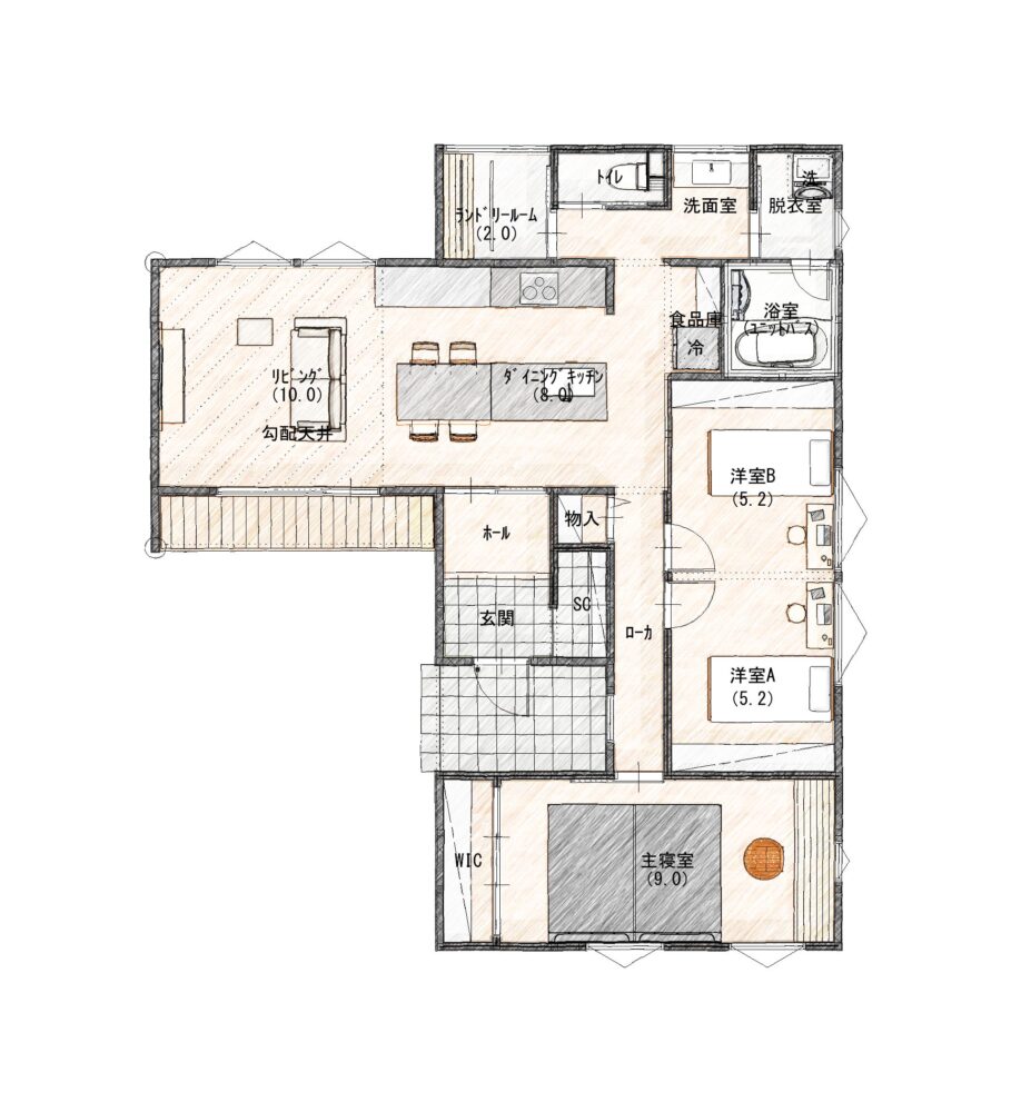 勾配天井のリビングが空間に開放感を与え、将来仕切れる洋室はライフステージに合わせて変化可能。