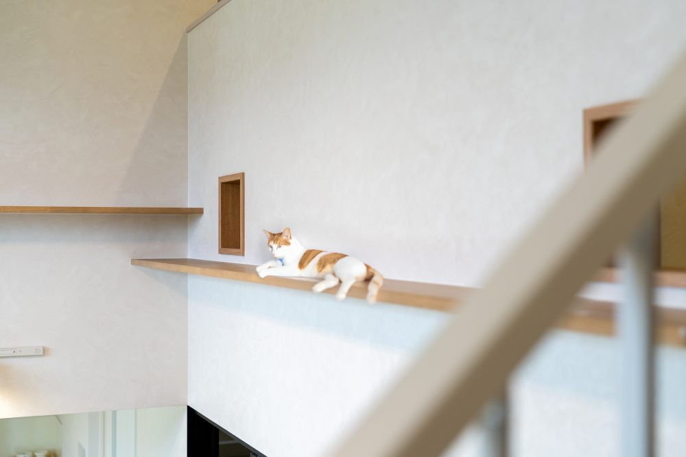 吹抜けのあるリビングにはキャットウォークを設け、猫が好きな高さで自由に寛げる空間に。