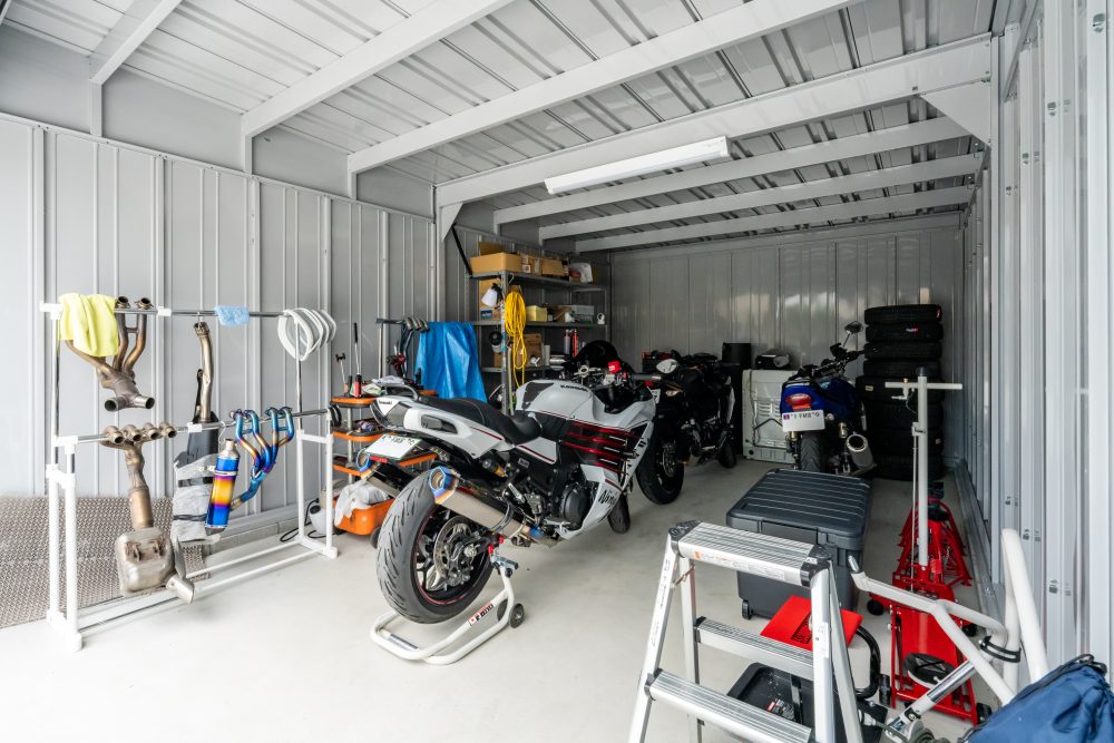 整備士としてのこだわりを反映した収納計画や、ヘルメット用の充電棚など、使い勝手を追求。